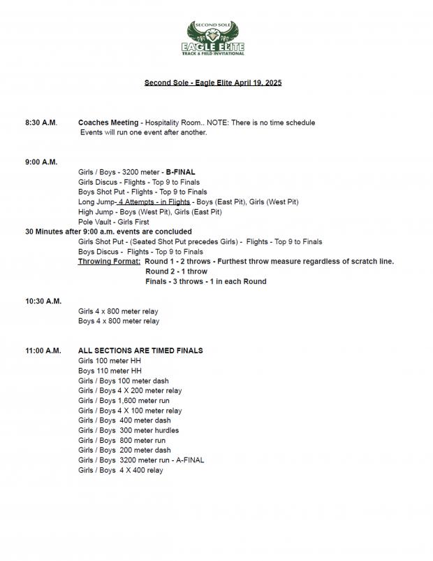 1. Date: April 19, 2025 - 8:30am Coaches Meeting - Hospitality Room